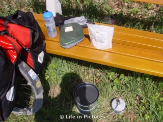 ZubereitungRisotto alla SicilianaIm nu war der Kocher ausgepackt, das Wasser erhitzt und Risotto alla Siciliana von Farmers Snack aufgegossen. Ich hatte mich richtig auf das Essen gefreut, war schon gespannt wie es schmeckt. Der erste Bissen war schon salzig, der zweite Salziger, der Dritte fat und so wechselte sich das dann ab, wobei die salzigen Bissen eindeutig überwogen. Nach der gefühlten Hälfte war mein Mund so trocken und ich konnte einfach nicht mehr weiteressen. Durch die Fahrt in der Packtasche muss sich das Salz vom Rest getrennt und kleine bis große Nester gebildet haben. Doch auch bestmögliches Umrühren hat das Salz nicht verteilt, schade.