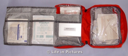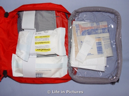 Die First Aid Tasche von Tatonka hat ein aufklappbares Innenteil mit diversen Einsteckfächern in verschiedenen Größen und eine Reißverschluss-Netztasche. Die Tasche besitzt zwei Befestigungsschlaufen mit denen sie beispielsweise am Hüftgurt eines Rucksackes befestigt werden kann.