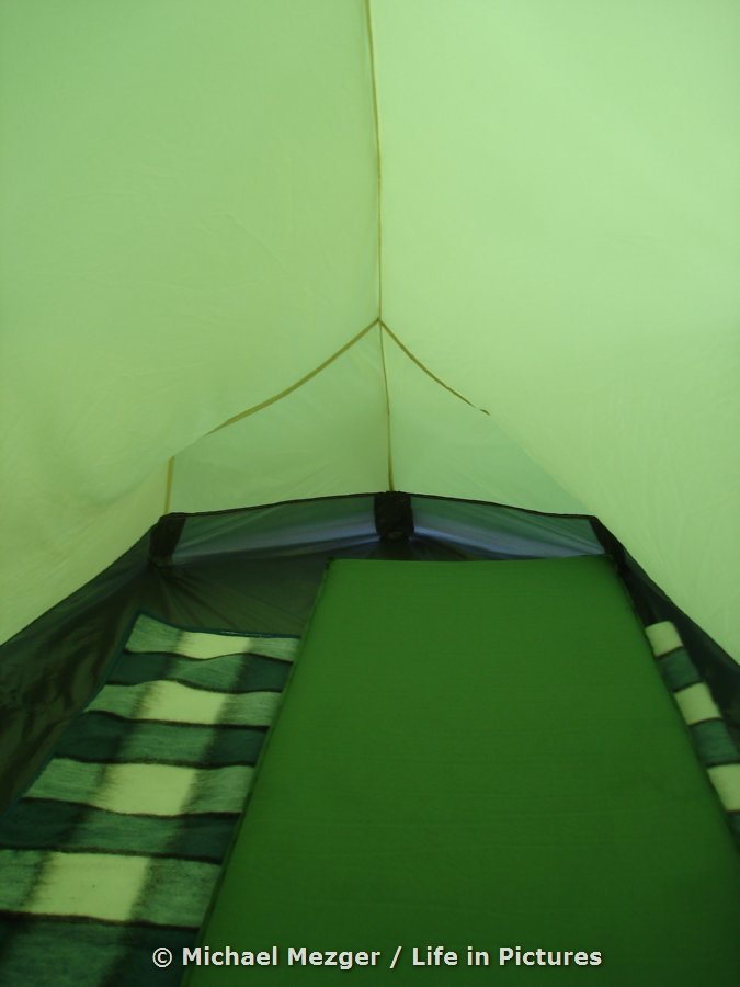 Belüftet wird das Zelt hauptsächlich über den Eingang und ein wenig durch den Abstand zwischen Außen- und Innenzelt. Bisher hatte ich immer Kondenswasserbildung am Außenzelt, diese hielt sich aber in Grenzen und trocknete schnell in der Sonne bzw. mit geöffnetem Eingang wieder ab.
