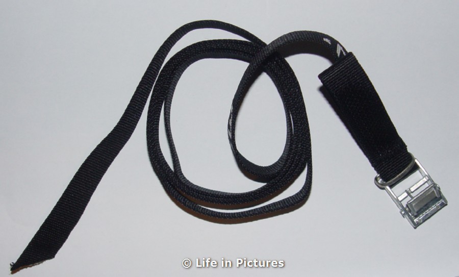 25 mm breit. Mit Kunststoffschnalle. Länge: 1,5 m Gewicht: 70 g